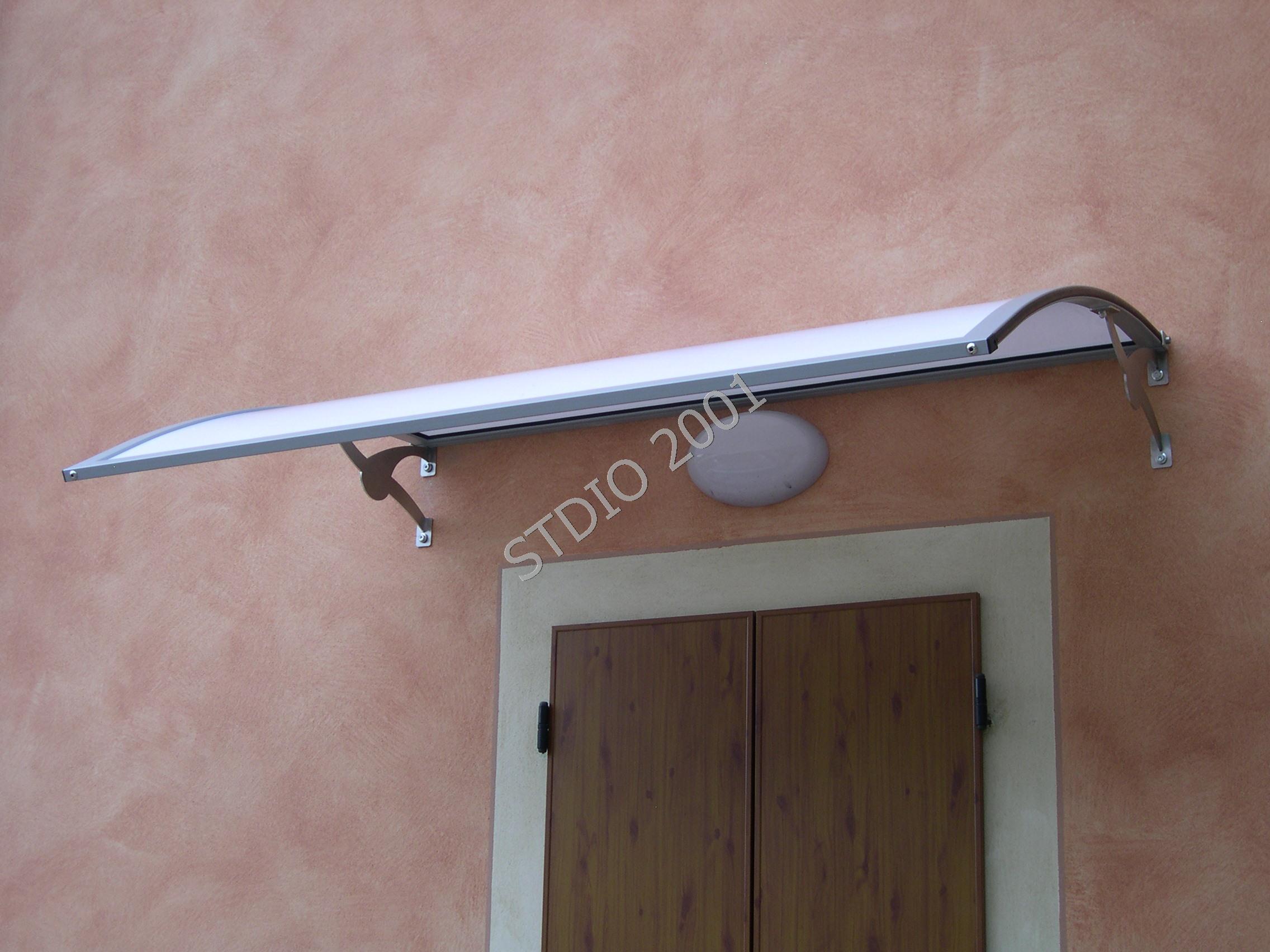 Pensilina con supporti corti inox a sostenere la struttura in profilo di alluminio calandrato atto a formare la copertura che viene fornita già assemblata al fine di facilitare il montaggio.
